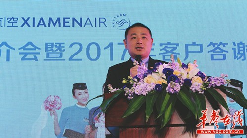 厦航湖南分公司总经理姜玉林向与会代表致欢迎词,介绍了厦航湖南分公司近年来的整体发展情况,他说,“ 厦门航空一直秉持着‘以诚为本,以客为尊’的诚信服务体系,自从10月29日拉开2017年冬春航季序幕以来,本航季厦航在湖南共投入7架过夜飞机,长沙出港共44条航线,覆盖27个航点。长沙出港北京、毕节、天津、成都、重庆、哈尔滨、台湾等27条国内及地区航线,并首次在长沙-北京航线采用波音787宽体机执飞,通过福州、厦门、泉州中转可通达包括温哥华、悉尼、墨尔本、阿姆斯特丹等欧美澳在内的22个国际目的地。”