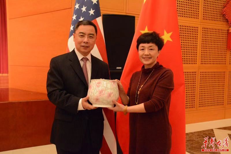 活动最后,陈利的代表作品《金玉满钵》赠送给中国驻美大使馆收藏并展示。陈利介绍说,《金玉满钵》以宋代官窑的器形为蓝本,运用稀有匮乏的高白泥,采用醴陵独特的高温釉下彩工艺,纯手工制作而成。