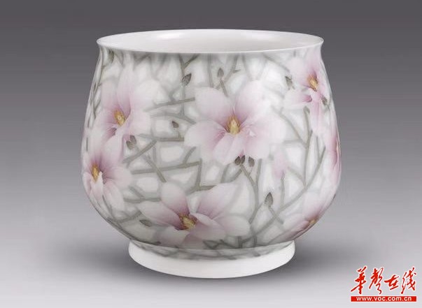 《金玉满钵》胎料“白如凝脂,素若积雪”,上绘玉兰花。玉兰运用黄金为着色剂的玛瑙红,烧成时容易变化。整个作品折枝满花,环绕其身,典雅、圆满、柔和、尊贵,寓意着中国繁荣富强。