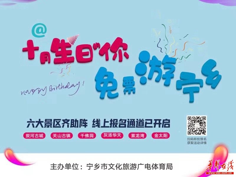 推介会上,宁乡市委常委、宣传部部长彭娟重点推介了“生日免票游宁乡”活动。活动面向全国游客,通过报名获得机会的游客,十月份,可在生日当天凭身份证等有效证件免费游览炭河古城、关山古镇、千佛洞、灰汤紫龙湾、灰汤金太阳、灰汤华天等宁乡知名景点。