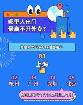 值得一提的是,虽然一线城市的游客订单输入表现并不明显,但来自“北上广深杭”五地的用户却依然是假期外卖消费的“领头羊”。人走到哪、外卖就点到哪,想吃什么、想买什么的时候叫个外卖,已经成为他们生活中的“肌肉记忆”。