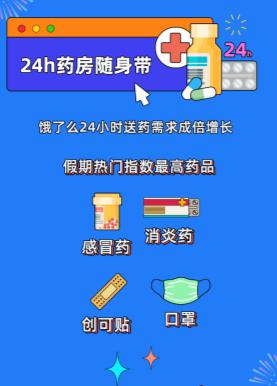过去,出门在外要背着各类医药用品以备不时之需。如今,全国300个城市、超10万家药店已经接入饿了么24小时送药服务,把“药房”装进手机里,给假期出游的行囊再度“减负”。饿了么数据显示,国庆黄金周期间,24小时送药需求成倍增长,其中感冒药、消炎药、创可贴和口罩成为用户下单最高频的医药用品。