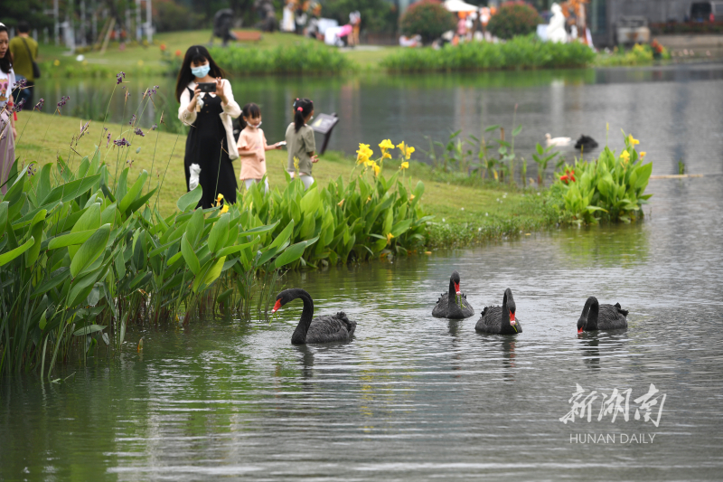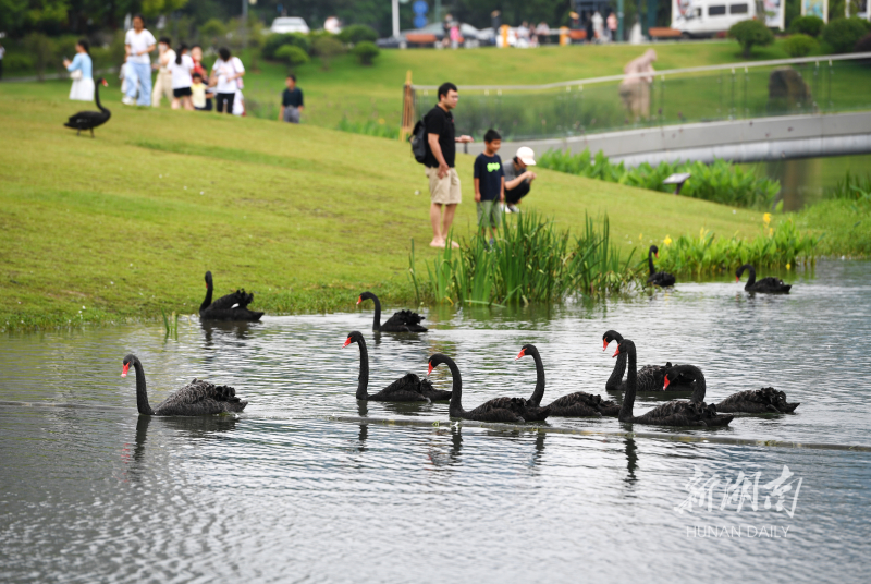 6月5日,长沙李自健美术馆旁的“天鹅湖”,一群黑天鹅在水中游弋,吸引不少游客驻足观赏。“天鹅湖”原本是湘江到洋湖的廊道,为一个三角地带,低洼、荒芜。2016年李自健美术馆建设时,将之改造成了一个湖,并引进了20只黑天鹅放入湖中,经过6年多时间的繁衍,黑天鹅已有60多只。 湖南日报全媒体记者 田超 摄