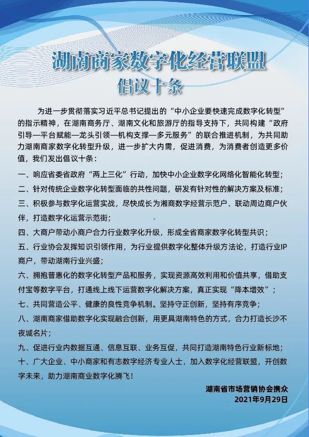 倡议由湖南省市场营销协会领衔,携省湘菜产业促进会、长沙市米粉行业协会、火宫殿、长房集团、益丰大药房、天宝兄弟、易裕和餐饮、木村屋、奢匠荟等特色行业协会、商家代表共同发起湖南商家数字化经营倡议十条提出积极参与数字化运营实战,尽快成长为湘商数字经营示范户、联动周边商户伙伴,打造数字化运营示范街;商家借助数字化实现融合创新,用更具湖南特色的方式,合力打造长沙不夜城名片等措施,共同构建“政府引导—平台赋能—龙头引领—机构支撑—多元服务”的联合推进机制。