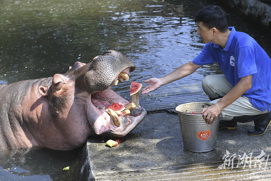 7月14日,长沙生态动物园,工作人员给河马投喂西瓜。