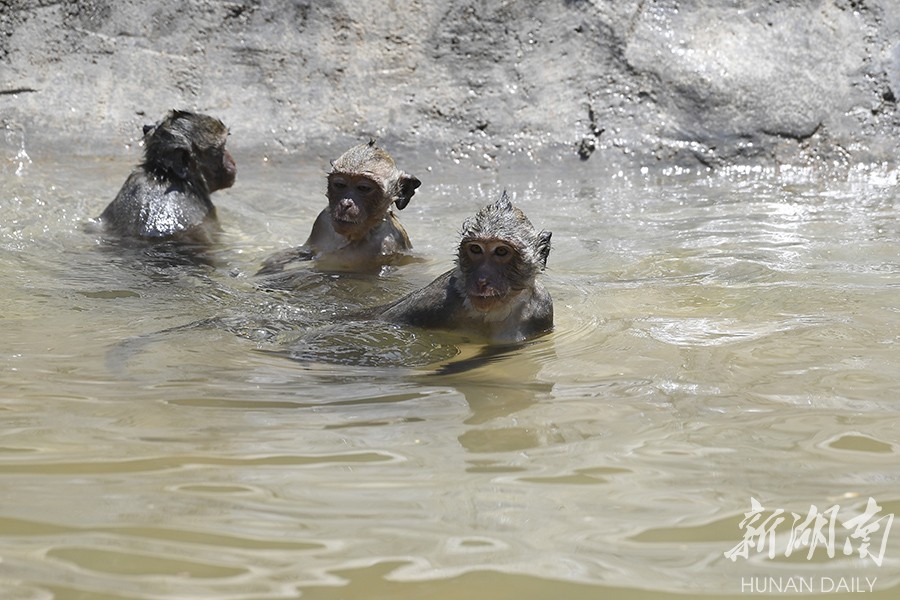 7月14日,长沙生态动物园,长尾猕猴泡在泳池里避暑。
