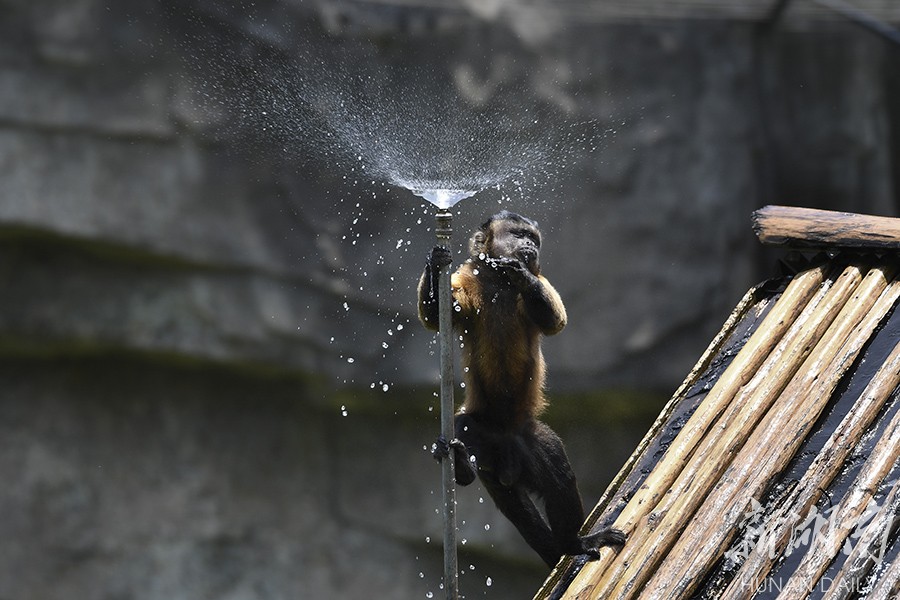 7月14日,长沙生态动物园,黑帽悬猴在自动喷淋边“冲凉”。