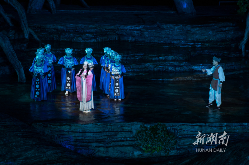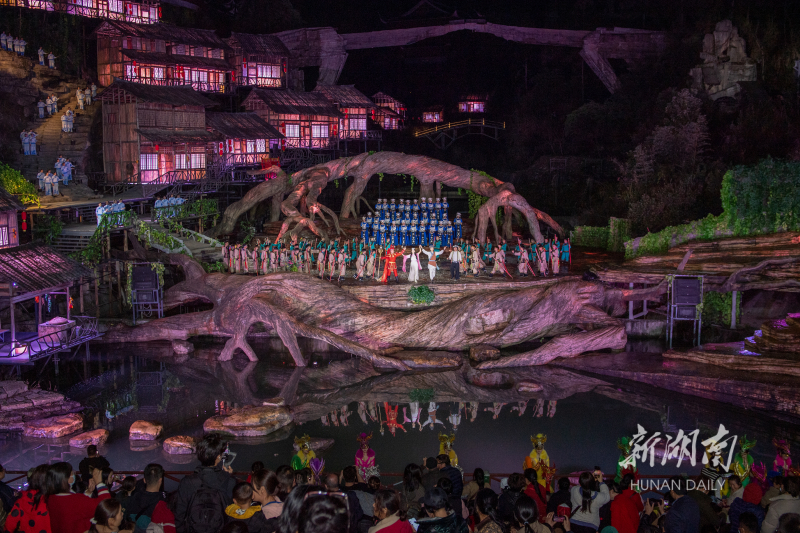 3月8日晚,大型山水实景音乐剧《天门狐仙·新刘海砍樵》迎来今年首场演出。当晚,张家界天门山峡谷大剧场内座无虚席,华丽的舞美、动人的故事令在场的2000余名观众倍感震撼。向韬 摄(一审:马俊达 二审:王立三 三审:刘建光)