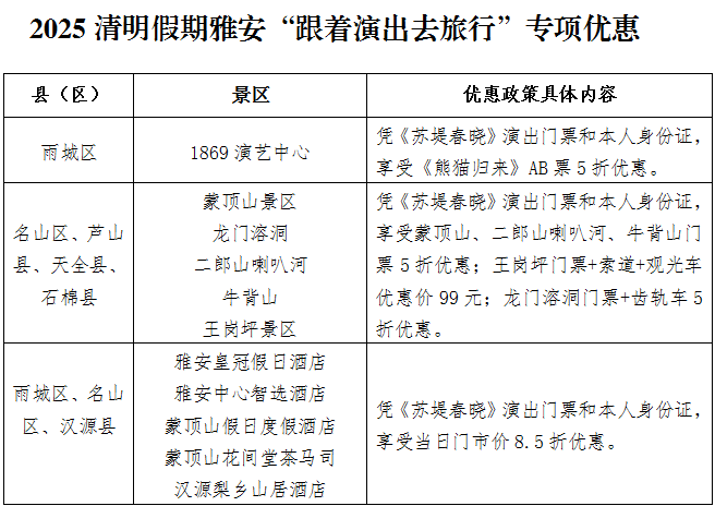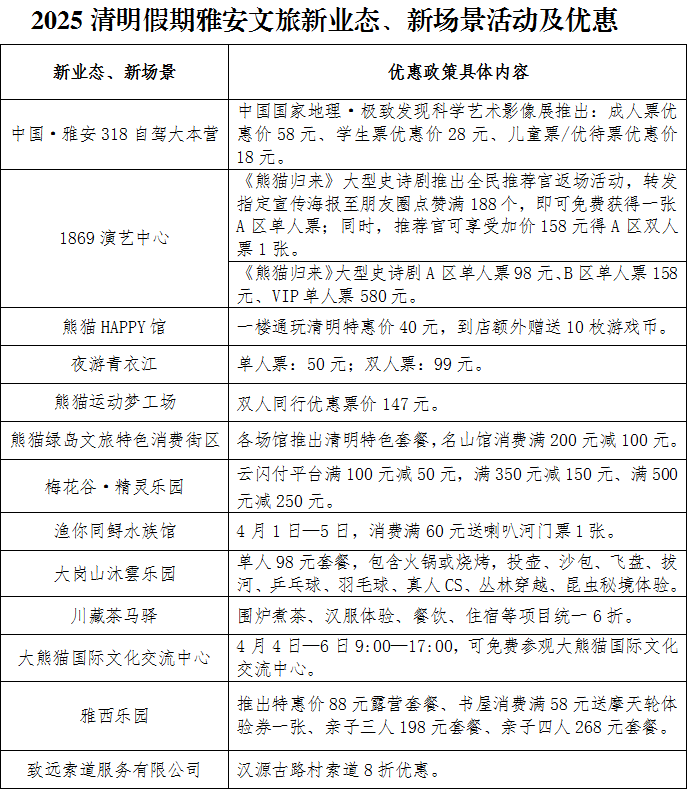 据雅安市文化广播电视体育和旅游局统计,2025年清明小长假期间,共推出活动40项,其中、“觅春趣”活动23项,“祈春安”活动3项,“趣运动”活动6项,“品书香”活动8项;推出优惠政策69项,其中“跟着演出去旅行”专项优惠3项、景区优惠12项、酒店优惠22项、民宿优惠18项、新业态新场景优惠14项。