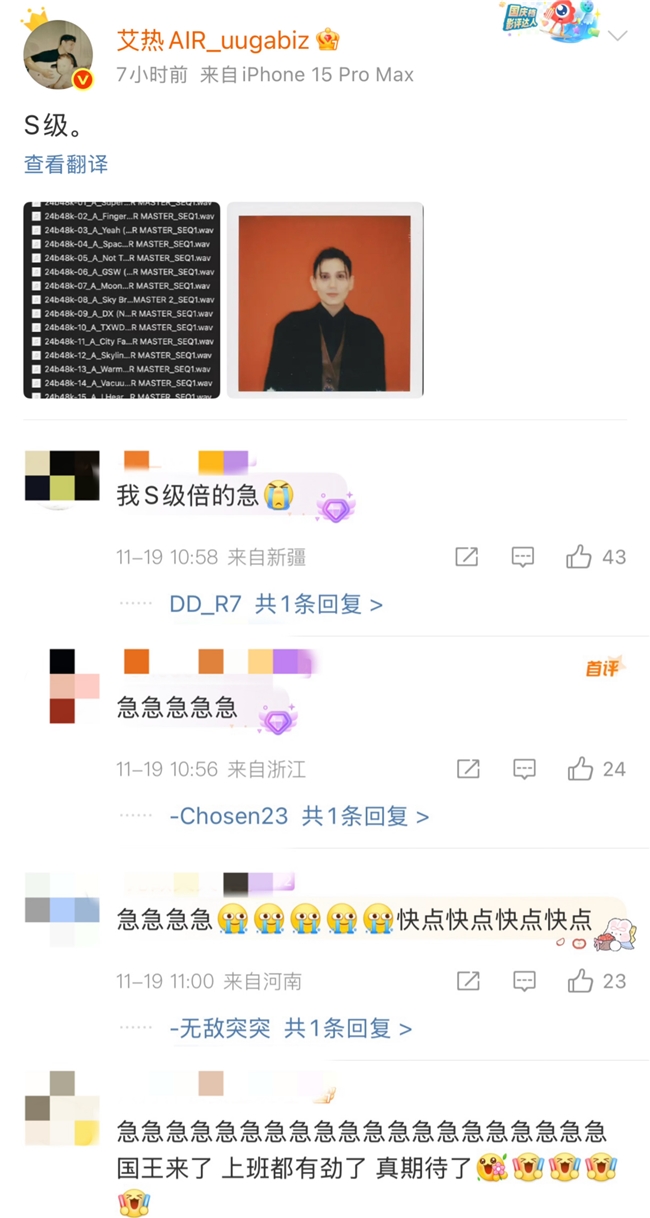 “艾热的含金量还在上升”“没想到一个rapper词写的那么温暖,声音那么温柔”“艾师傅真的是六边形战士”“觉得他俩的感情特别真挚,就导致这歌给人的感觉真的神了”“孜巴的低音巨好听,超喜欢他们唱歌”“好高级的音色,女声太有特色了!神秘、慵懒又清脆”“夫妻相,气质太独特了”“太甜了,太好听,每天听”……