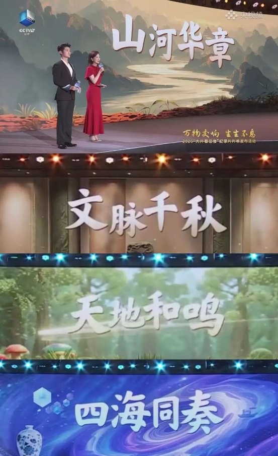 “山河华章”“文脉千秋”“天地和鸣”“四海同奏”四个篇章,如同一场酣畅淋漓的交响乐。62部纪录片作品精彩亮相,彰显了纪录片“国家队”的实力和格局。