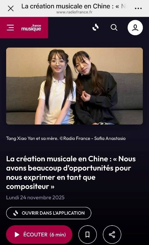 华声在线 2026年1月8日讯,当西方直播间响起东方三弦的古朴清音,一场跨越山海的文化对话由此展开。欧洲顶级音乐权威平台——法国国家音乐电台(France Musique)近日推出中国少年三弦演奏者、音乐人汤笑嫣的专场专访,通过播放采访录音与深度解读,将这一承载千年东方韵味的传统乐器,带入覆盖全球30余个国家的千万听众视野。