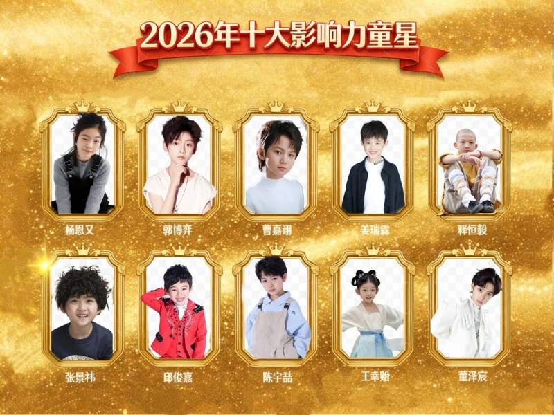 1月26日,由中国十大童星评选组委会联合多家媒体及网友共同评选的2026年中国十大影响力童星排行榜正式揭晓,杨恩又、郭博弈、曹嘉诩、姜瑞霖、释恒毅、张景祎、邱俊熹、陈宇喆、王幸贻、董泽宸等十位演员凭借扎实的演技、丰富的作品储备及良好的社会口碑脱颖而出,而韩昊霖、林子烨、王圣迪等往届热门人选因年龄增长遗憾告别童星榜单,标志着内娱童星阵营的新老交替。本次评选综合考量作品影响力、演技表现、媒体曝光度及正能量示范效应,旨在发掘兼具实力与潜力的新生代演艺力量。