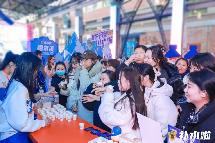 哈尔滨站的特色活动,更是将氛围推向新高。结合哈尔滨当地的冰雪特色,东鹏补水啦将冰雪元素巧妙融入活动现场,打造了极具地域特色的互动场景。试饮台前挤满了尝鲜清润雪梨味新品的市民,互动区的趣味冰壶游戏引得大小朋友围拢参与,还有不少消费者手拿补水啦在代言人立牌旁打卡留念,留言墙也很快贴满了手写祝福,现场气氛热烈而欢快。