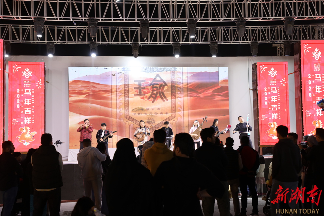 歌曲环节巧思频现。瑜乐团唱响湖湘特色曲目《走啰嚯嚯》、清新灵动的《稻草人》,武侠音乐联奏/唱《侠影当歌》串联经典旋律,《海阔天空》引发全场情感共鸣,多样曲风串联起传统与现代的音乐脉络。返场曲目《浏阳河&茉莉花》以电音重构经典,中阿观众同声哼唱,为演出画上圆满句号。