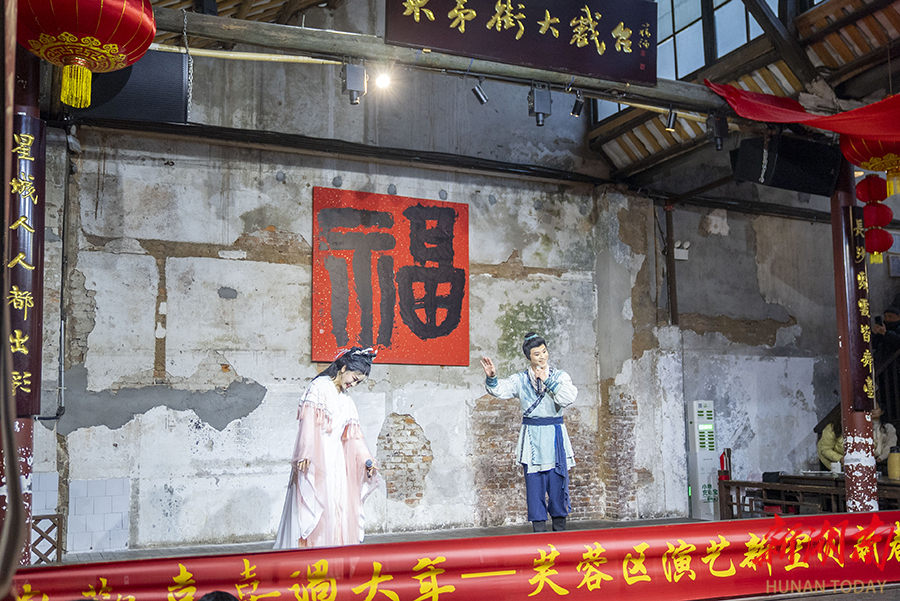 2月9日,长沙市东茅街茶馆,演员在表演节目《采茶调》。当天,“欢欢喜喜过大年 —— 芙蓉区演艺新空间新春文旅展演” 在长沙市东茅街茶馆开演。展演汇聚民乐演奏、经典花鼓戏、京剧选段、越剧表演与潮口秀等多元形式,并设置非遗体验区,书法家为市民书写春联送福,营造出浓厚的节日文化氛围。 湖南日报全媒体记者 童臻熙 摄