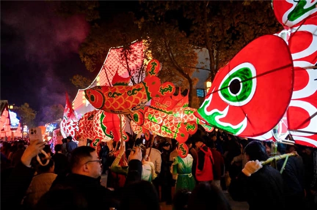 春节期间(2.14-3.3),景区以“非遗大年·喜乐嘉乐比”为主题,推出全天候演绎活动,所有内容均基于官方发布,无任何杜撰。核心特色聚焦非遗体验与实景演绎,其中双非遗盛宴最为吸睛——安吉上舍化龙灯与安徽鱼灯强强联合,灯光摇曳间复刻“一夜鱼龙舞”的诗意;每日上演的1600℃非遗打铁花,泼洒成金色瀑布,搭配火壶表演,惊险又惊艳,以此庆贺戚继光大捷。